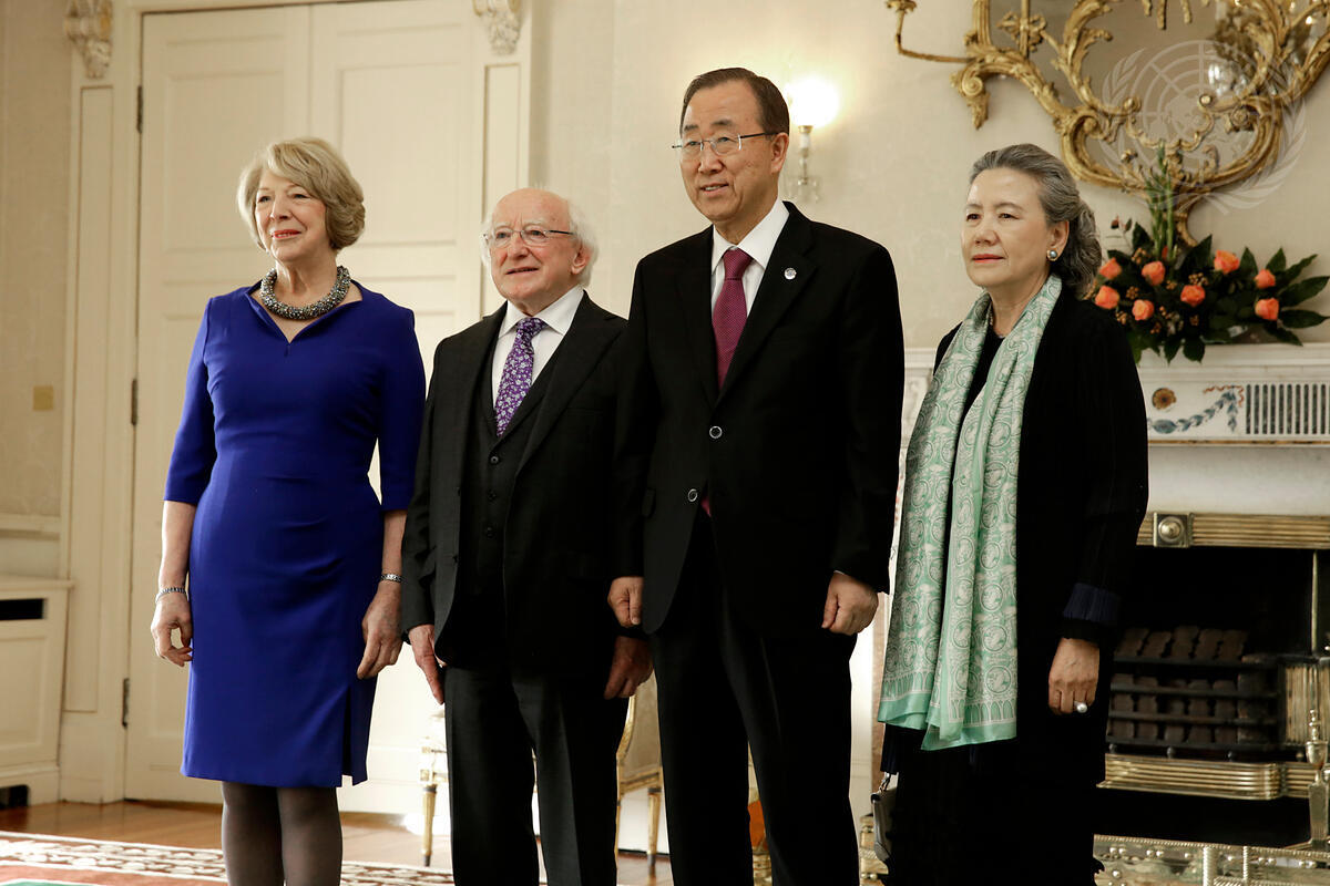 Secretary-General Ban Ki-moon (second from right) and his wife, Yoo Soon-taek (right), meet with Michael D. Higgins, President of Ireland, and First Lady Sabina Higgins, at the official residence of the President in Dublin.