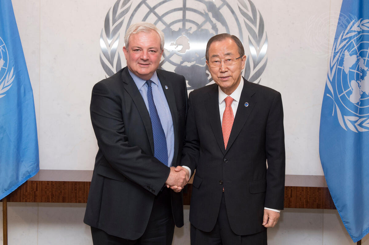 Secretary-General Ban Ki-moon (right) with Stephen O'Brien, newly sworn-in Under-Secretary-General for Humanitarian Affairs and Emergency Relief Coordinator.