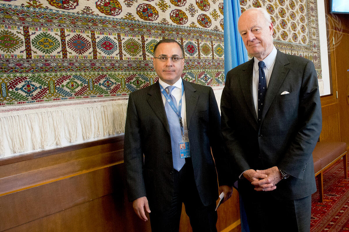 Staffan de Mistura, Special Envoy of the Secretary-General for Syria, met with a delegation of the State of Kuwait, led by Jamal Al-Ghunaim, Permanent Representative to the United Nations in Geneva, as part of the ongoing Geneva Consultations on Syria.