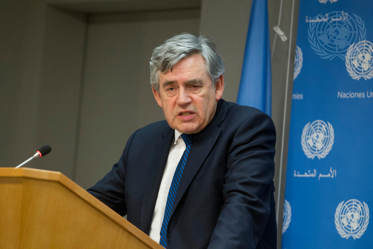 Gordon Brown, United Nations Special Envoy for Global Education, briefs journalists on the need for a humanitarian fund to provide education for children in emergency and crisis situations.