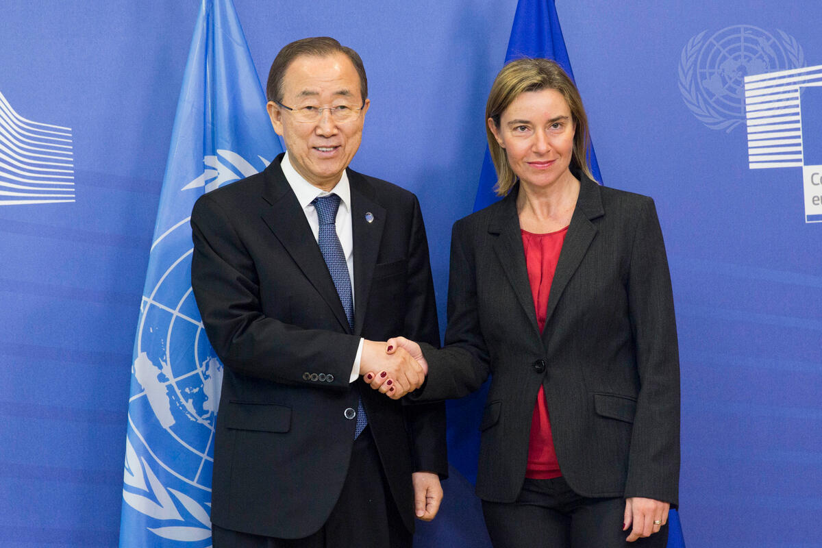 Secretary-General Ban Ki-moon (left) meets with Federica Mogherini, High Representative of the European Union for Foreign Affairs and Security Policy and Vice-President of the European Commission.