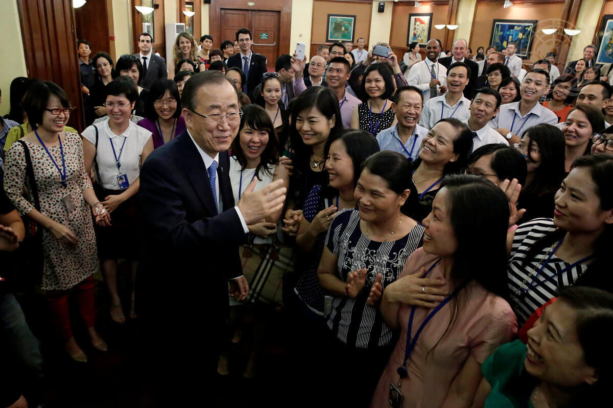 Secretary-General Ban Ki-moon (centre left) greets United Nations staff members in Hilton Hanoi Opera Hotel.