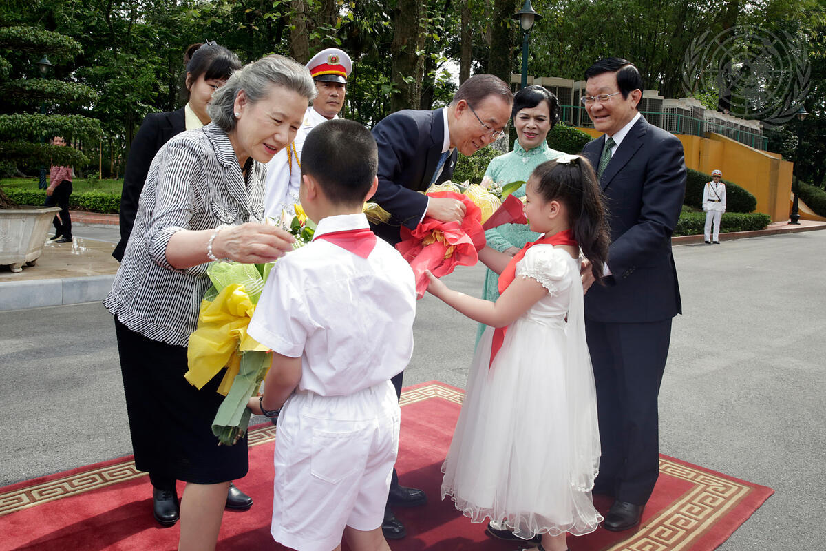 Welcoming ceremony as Secretary-General Ban Ki-moon (centre) and his wife, Yoo Soon-taek (left), arrive at the Presidential Palace in Hanoi, for the Secetary-General's meeting with Truong Tan Sang (right), President of the Socialist Republic of Viet Nam.