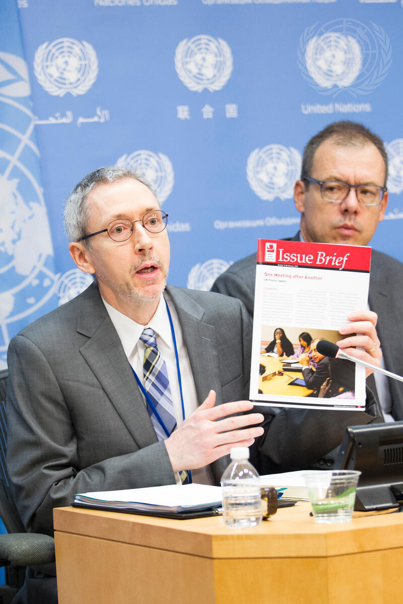 Glenn McDonald (left), Small Arms Survey Senior Researcher and Yearbook Coordinator, briefs journalists. At his side is Olivier Marc Zehnder, Deputy Permanent Representative of Switzerland to the UN.