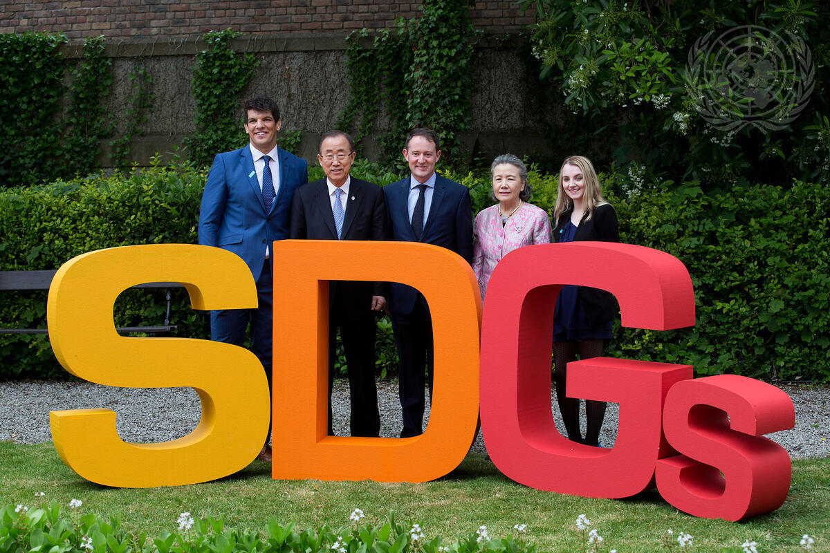 Secretary-General Ban Ki-moon (second from left) poses for a group photo behind an art work - Sustainable Development Goals (SDGs) - in Dublin, Ireland. From left to right: UNICEF Goodwill Ambassador Donncha O'Callaghan; Mr. Ban; Sean Sherlock, Minister for Overseas Development Assistance, Trade Promotion and North/South Co-Operation of Ireland; Mr. Ban's wife Yoo Soon-taek; and UNICEF High Level Supporter Evanna Lynch.