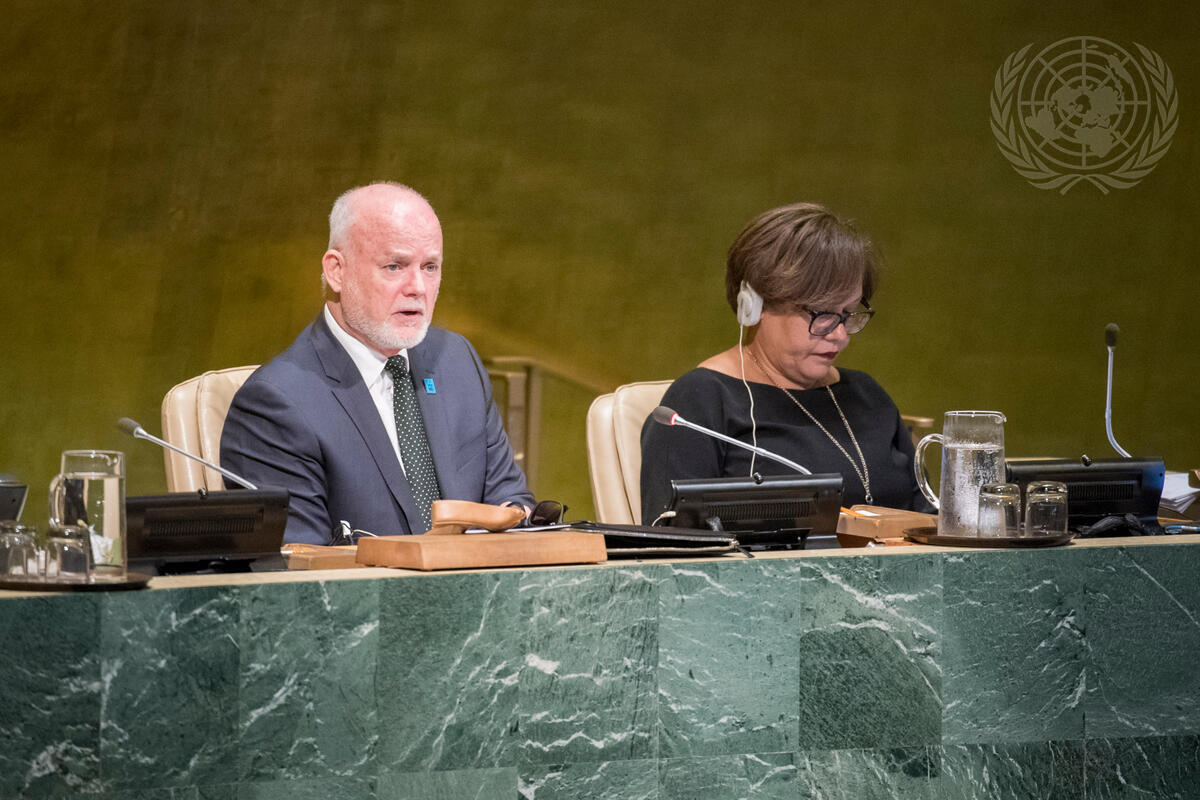 Peter Thomson (left), President of the Assembly’s seventy-first session, addresses the meeting. At his side is Ruth de Miranda, Director of the General Assembly and Economic and Social Council (ECOSOC) Affairs Division.