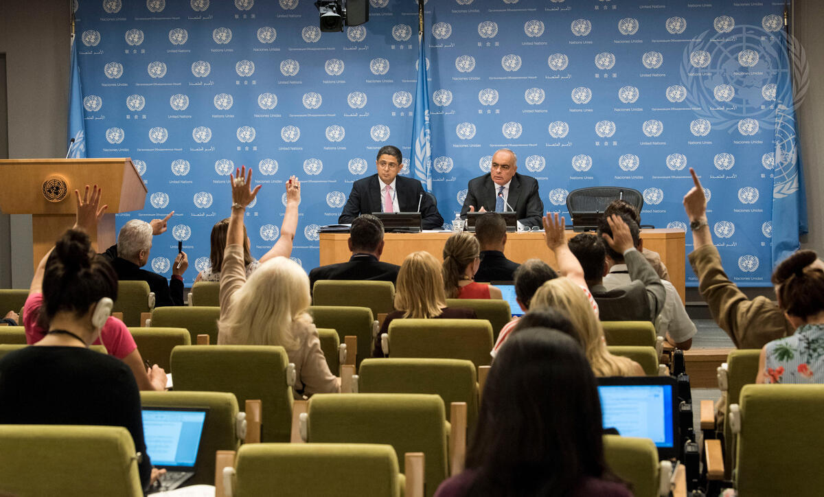Amr Abdel Latif Aboulatta (top right), Permanent Representative of the Arab Republic of Egypt to the UN and President of the Security Council for August, briefs journalists on the Council’s programme of work for the month.