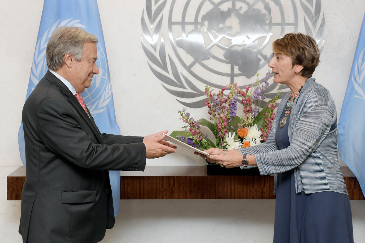 Narjess Saidane (right), new Permanent Observer for the International Organization of la Francophonie to the United Nations, presents her credentials to Secretary-General António Guterres.