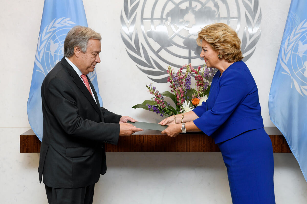 Geraldine Byrne Nason (right), new Permanent Representative of Ireland to the United Nations, presents her credentials to Secretary-General António Guterres.