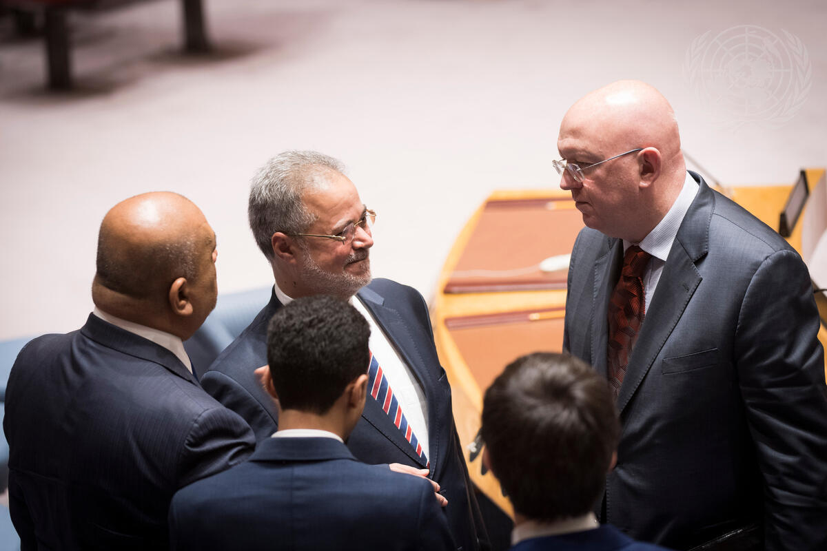 Abdulmalik Abduljalil Ali Al-Mikhlafi (centre), Deputy Prime Minister and Minister for Foreign Affairs of the Republic of Yemen, speaking with Vassily Alekseevich Nebenzia (right), Permanent Representative of the Russian Federation to the UN, at the Security Council meeting on the situation in Yemen. Also pictured, Khaled Hussein Mohamed Alyemany (left), Permanent Representative of Yemen.