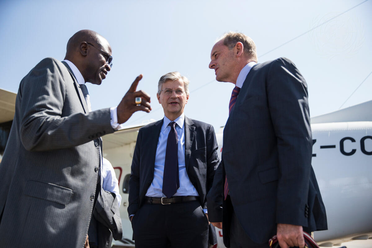 Mr. Lacroix (centre) during his visit to Malakal. At right is David Shearer, Special Representative of the Secretary-General and Head of the United Nations Mission in South Sudan (UNMISS).