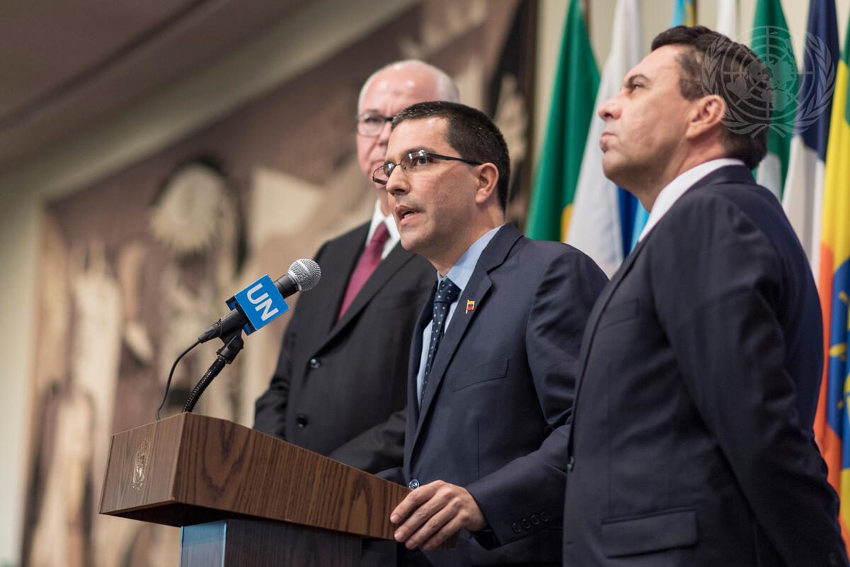 Jorge Arreaza (centre), Minister for Foreign Affairs of the Bolivarian Republic of Venezuela, speaks to journalists.