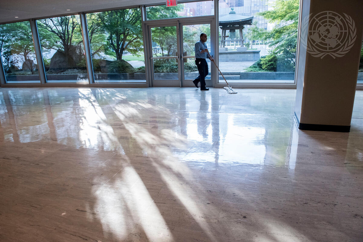 A worker cleans the floor of the hallways of the UN Secretariat in preparation for the seventy-second session of the General Assembly's annual debate.