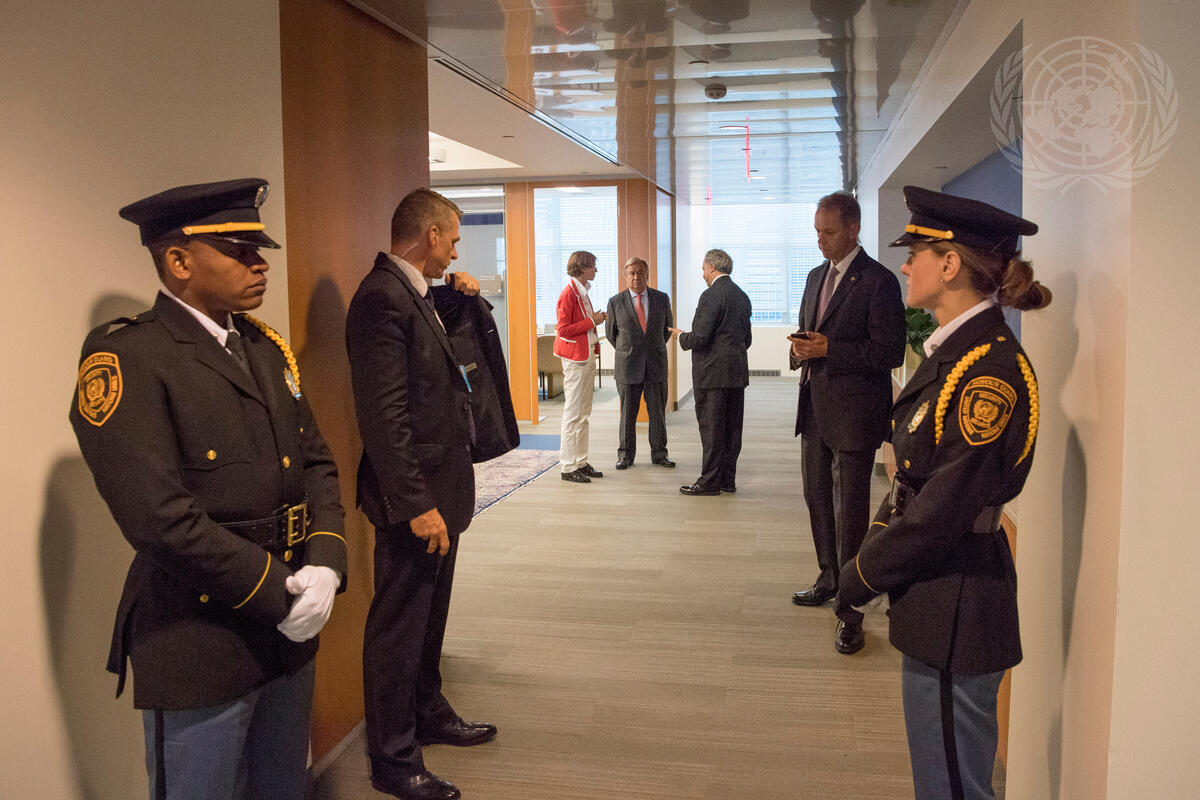 Secretary-General António Guterres (centre) during a lull between bilateral meetings in the week of the General Assembly’s annual general debate.