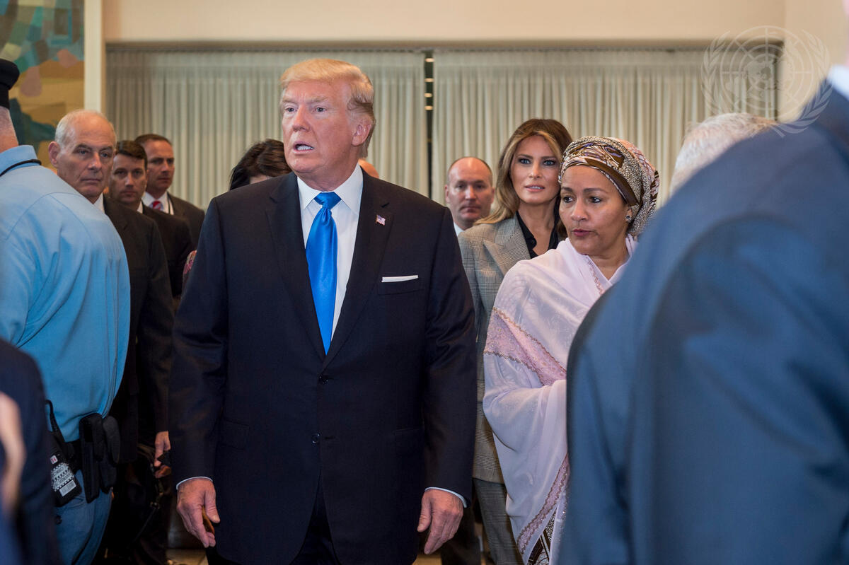 United States President Donald Trump and his wife Melania Trump (fourth from right) arrive at UN headquarters for the general debate of the General Assembly’s seventy-second session. Also pictured, Deputy Secretary-General Amina Mohammed (third from right).