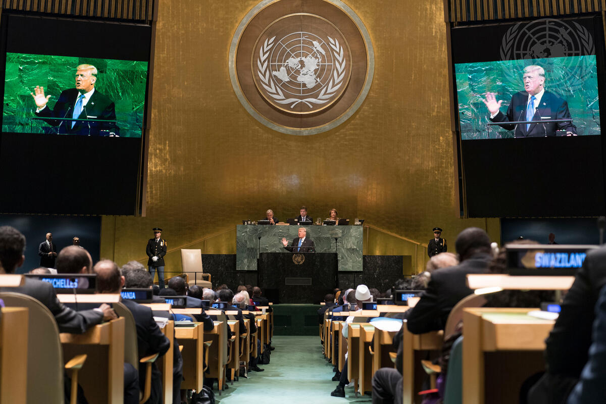 A wide view of the General Assembly Hall as United States President Donald Trump (shown on screens) addresses the general debate of the Assembly’s seventy-second session.
