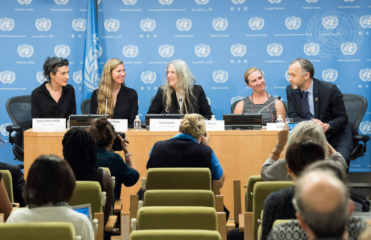 Patti Smith (centre), eminent singer-songwriter, poet, and climate change activist, addressed a press conference on a concert by Pathway to Paris scheduled for 5 November at Carnegie Hall. Pathway to Paris is a civil society organization that uses music to advocate for climate action. The press conference was sponsored by the UN Development Programme (UNDP).