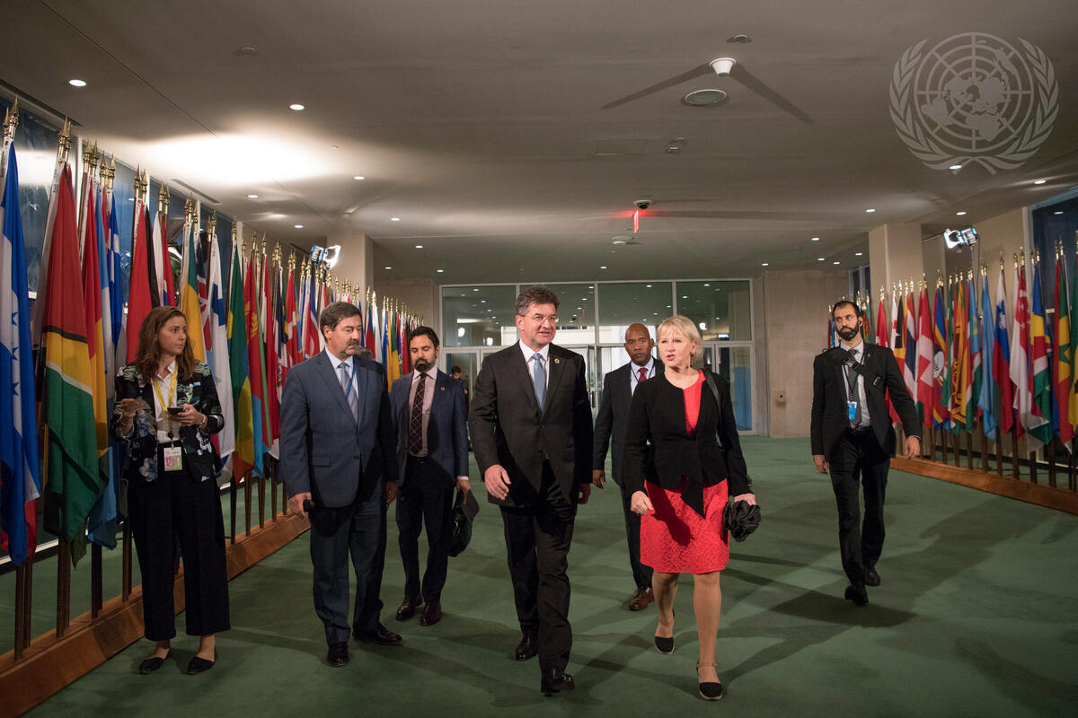 Miroslav Lajcák (centre left), President of the seventy-second session of the General Assembly, with Margot Wallström, Minister for Foreign Affairs of Sweden, during the week of the Assembly's annual general debate.