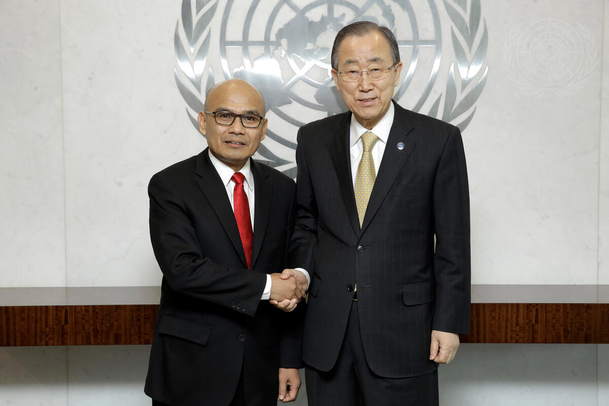 Desra Percaya (left), Permanent Representative of the Republic of Indonesia to the United Nations, pays a farewell call to Secretary-General Ban Ki-moon.