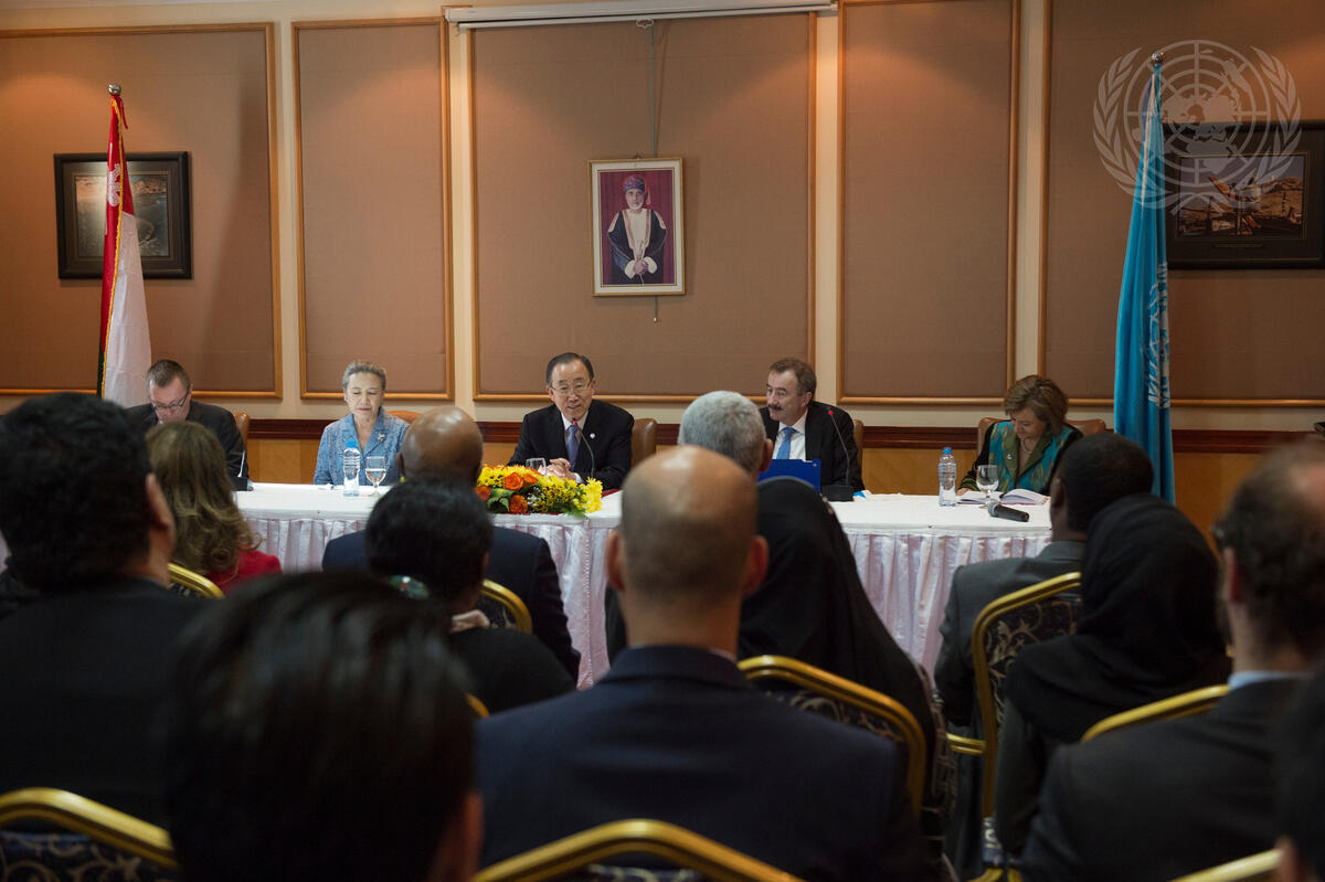 Secretary-General Ban Ki-moon (centre) speaks with UN staff while on an official visit to Oman.