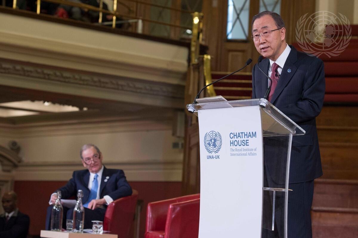 Secretary-General Ban Ki-moon addresses a public event on the topic, “The UN at 70: Time to invest in our global system”, co-hosted by the United Nations Association in the United Kingdom (UNA-UK) and Chatham House, the Royal Institute of International Affairs. Seated at left: Sir Jeremy Greenstock, Chairman of UNA-UK and former Permanent Representative of the United Kingdom to the UN.