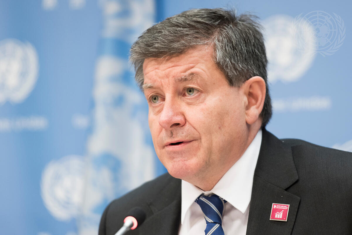 Guy Ryder, Director-General of the International Labour Organization (ILO), addresses a press conference on the Global Initiative on Decent Jobs for Youth, which he launched at the opening of the 1-2 February annual UN Youth Forum, convened by the Economic and Social Council (ECOSOC). Briefing journalists with him were Azita Berar Awad, Director of the ILO Employment Policy Department; and Ana Saldarriaga, Global President of the international youth non-governmental organization AIESEC.