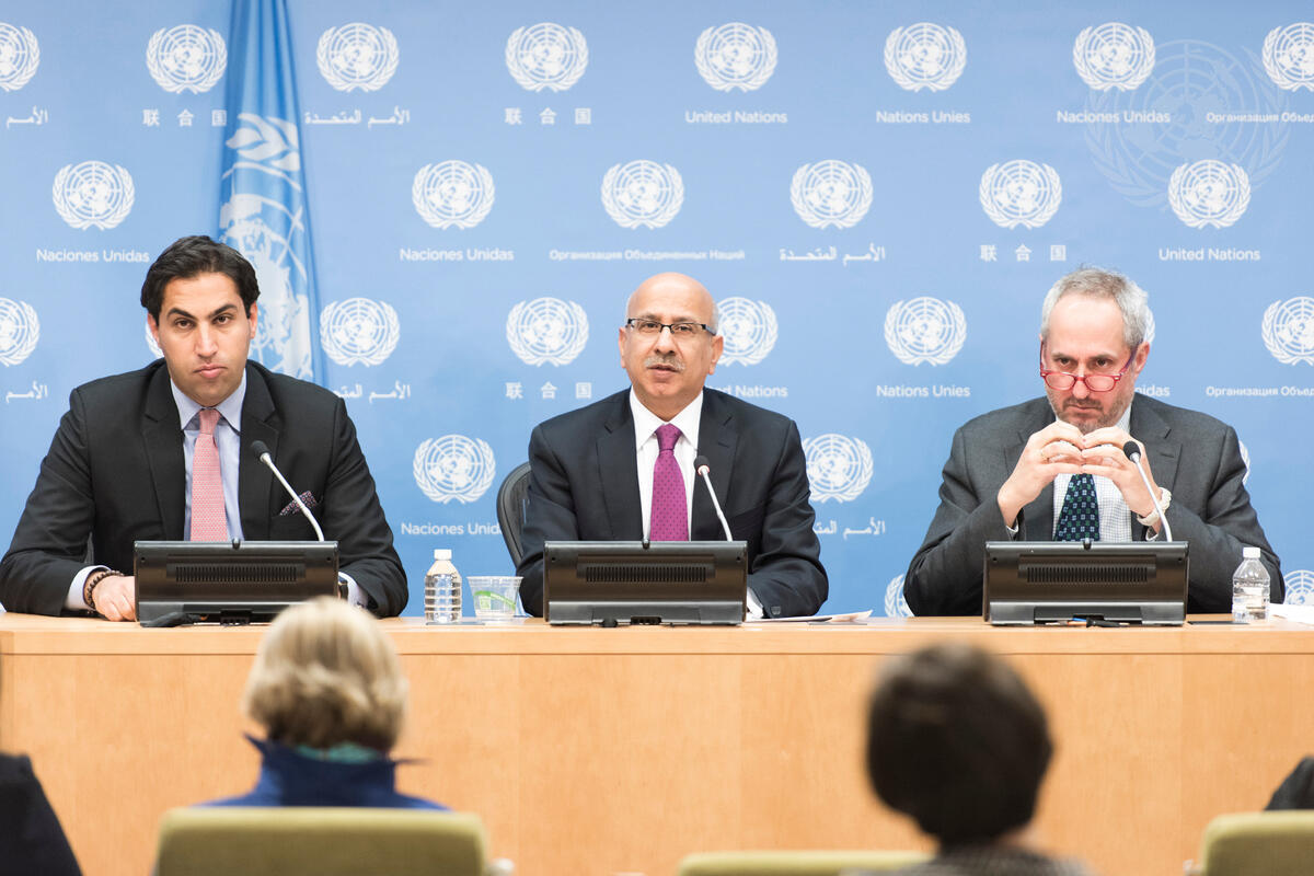 Navid Hanif, Director of the Office of the Economic and Social Council (ECOSOC), and Ahmad Alhendawi, Secretary-General’s Envoy on Youth (right), during a press conference concerning the upcoming ECOSOC Youth Forum, which will focus on the important role of young people in the implementation of the 2030 agenda for Sustainable Development.