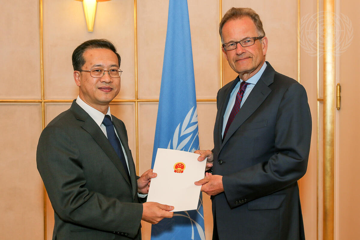 Ma Zhaoxu (left), new Permanent Representative of the People's Republic of China to the United Nations Office at Geneva (UNOG), presents his credentials to Michael Møller, Director-General of UNOG.