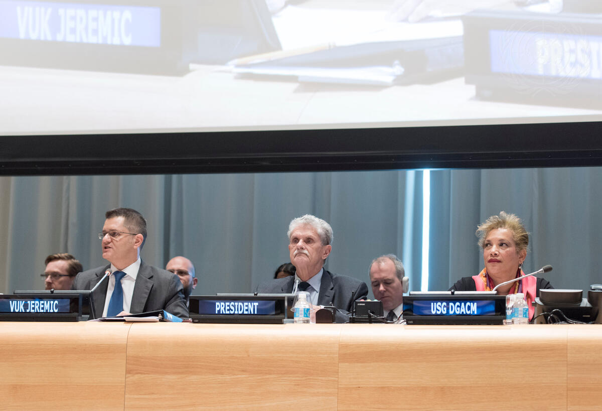 Vuk Jeremic (left on dais), former Minister for Foreign Affairs of the Republic of Serbia and former President of the UN General Assembly, addresses Member States regarding his candidacy. Pictured with him on dais: Mogens Lykketoft (centre), President of the seventieth session of the General Assembly; and Catherine Pollard, Under-Secretary-General for General Assembly and Conference Management.
