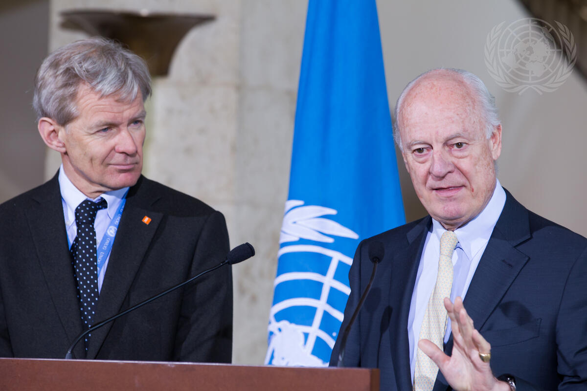 Staffan de Mistura (right), United Nations Special Envoy for Syria, together with his Special Adviser Jan Egeland, addresses journalists following the eighth meeting of the Task Force on Humanitarian Access to Syria.
