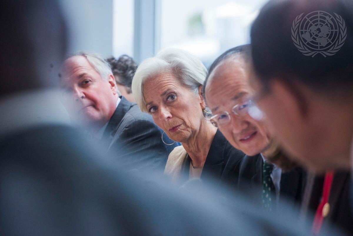 Christine Lagarde (centre), Managing Director of the International Monetary Fund (IMF), and Jim Yong Kim (right), President of the World Bank Group, listen to Secretary-General Ban Ki-moon's remarks at today's Carbon Pricing Leadership Coalition Meeting in Washington, DC, today.