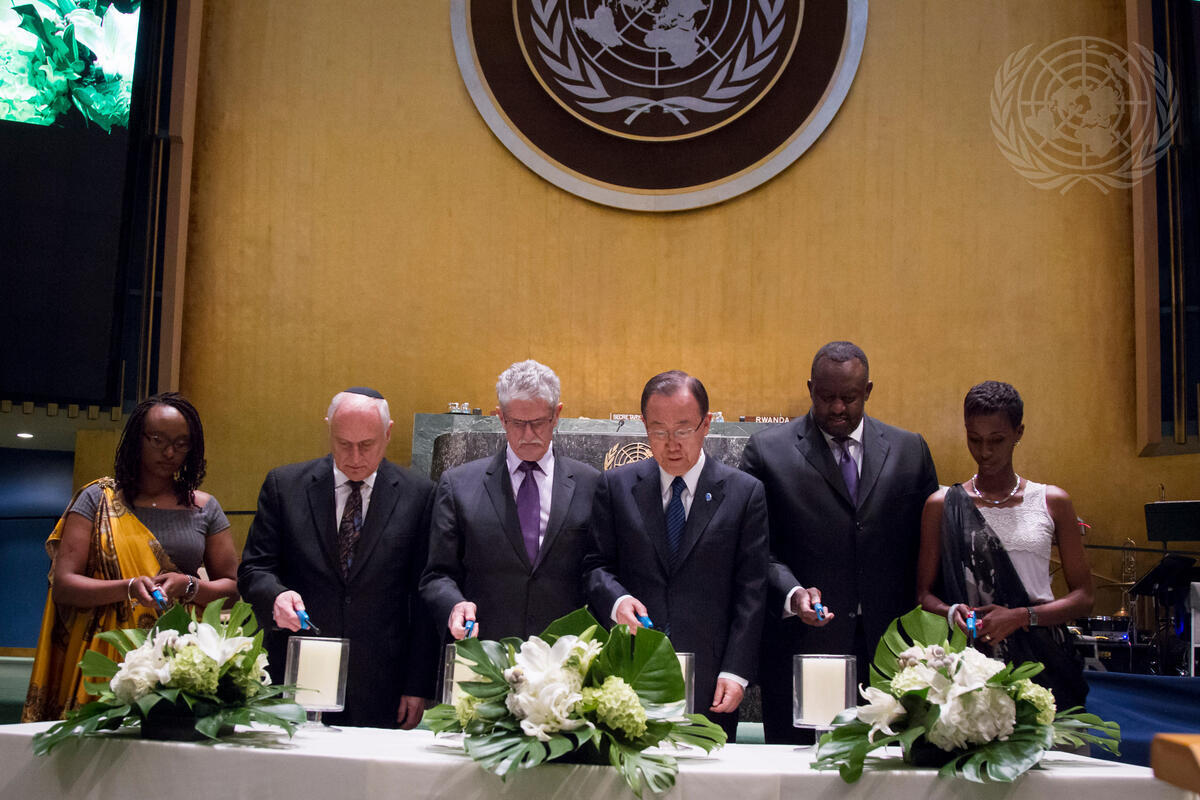 Participants light candles during the annual commemoration of the International Day of Reflection on the Genocide in Rwanda (7 April). From left: Frida Umuhoza, survivor and author of ""Frida: Chosen to Die, Destined to Live""; Malcolm I. Hoenlein, Executive Vice Chairman of the Conference of Presidents of Major American Jewish Organizations; Mogens Lykketoft, President of the seventieth session of the General Assembly; Secretary-General Ban Ki-moon; Eugène-Richard Gasana, Minister of State in Charge of Cooperation and Permanent Representative of Rwanda to the UN; and Nelly Mukazayire, Deputy Director of the Cabinet in the Office of the President of Rwanda. The event was organized by the UN Department of Public Information (DPI), in cooperation with the Permanent Mission of Rwanda.