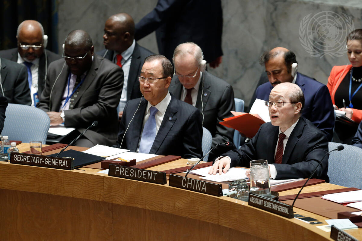 Liu Jieyi (front right), Permanent Representative of the People’s Republic of China to the UN and President of the Security Council for April, chairs the Council’s open debate on the issue of countering terrorism. At his side is Secretary-General Ban Ki-moon.