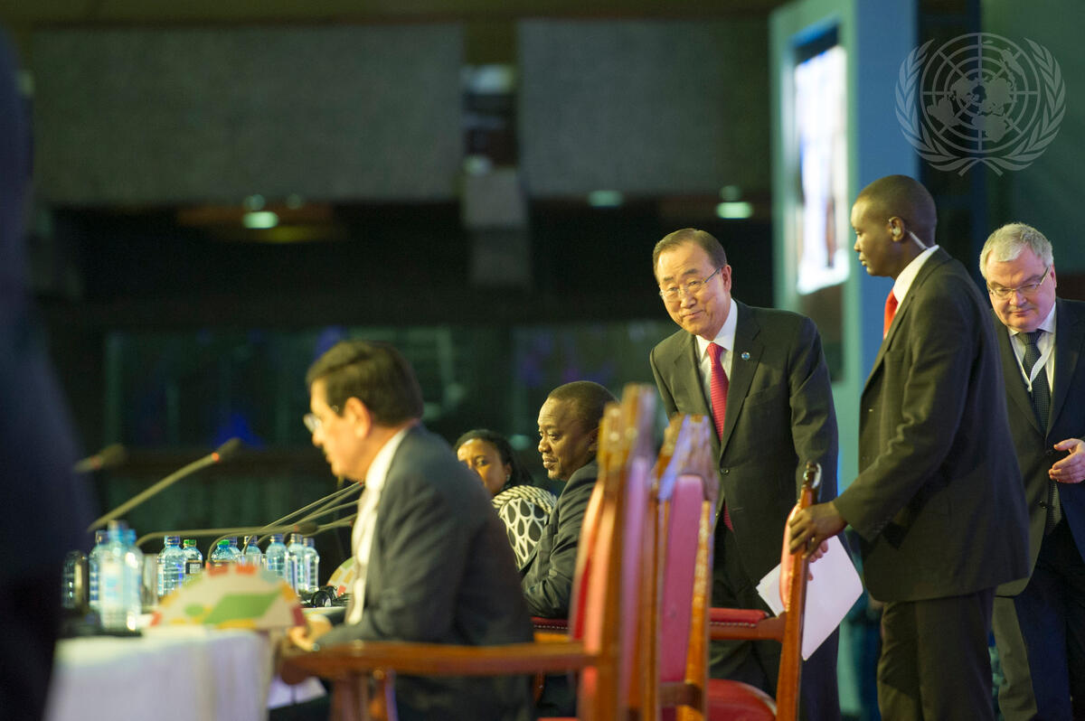 Secretary-General Ban Ki-moon (standing, left) is shown his seat for the opening of the fourteenth UN Conference on Trade and Development (UNCTAD), taking place in Nairobi, 17-22 July 2016.