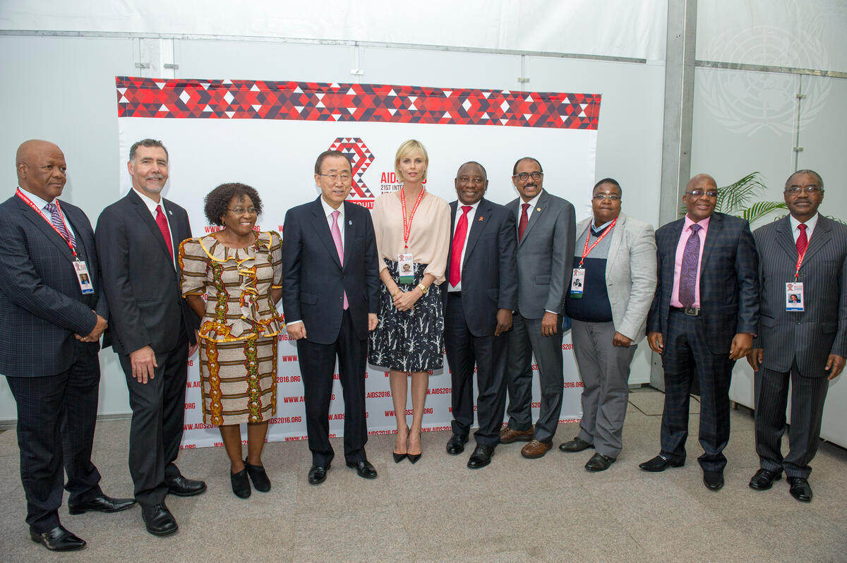 Secretary-General Ban Ki-moon (fourth from left) poses for a group photo with participants at the opening press conference of the 21st International AIDS Conference (AIDS 2016). He is flanked by Olive Shisana (left), AIDS 2016 Local Co-Chair and CEO of the South African Human Sciences Research Council (HSRC); and Charlize Theron, actor, UN Messenger of Peace and founder of the Charlize Theron Africa Outreach Project (CTAOP). Also pictured (starting at second from left): Chris Beyrer, AIDS 2016 International Chair and President of International AIDS Society; Cyril Ramaphosa, Deputy President of the Republic of South Africa; Michel Sidibé, Executive Director of the Joint United Nations Programme on HIV and AIDS (UNAIDS).