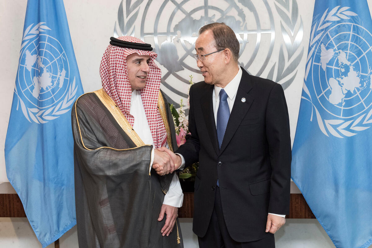 Secretary-General Ban Ki-moon (right) meets with Adel Ahmed Al-Jubeir, Minister for Foreign Affairs of Saudi Arabia.