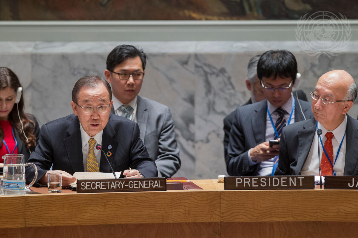 Secretary-General Ban Ki-moon (left) addresses the Security Council at its meeting today on the situation in the Middle East, including the Palestinian Question. At right is Koro Bessho, Permanent Representative of Japan to the United Nations and President of the Security Council for the month of July.