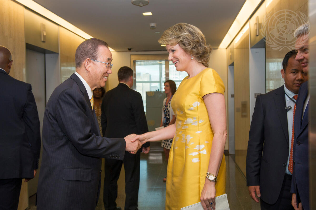 Secretary-General Ban Ki-moon (left) greets Queen Mathilde of Belgium, prior to the start of the General Assembly's High-Level Thematic Debate on Human Rights, being held 12-13 July at UN Headquarters in New York.