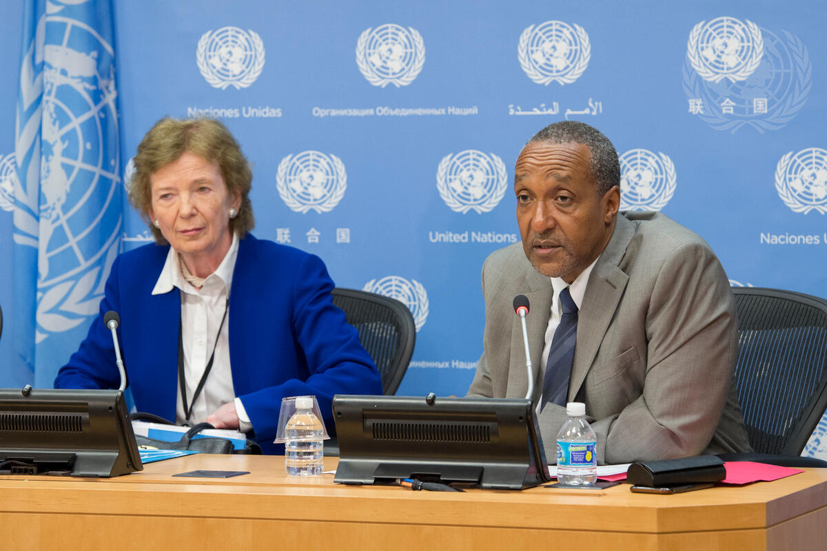 The Secretary-General's Special Envoys on El Niño and Climate, former President of Ireland Mary Robinson (left) and Macharia Kamau, Permanent Representative of Kenya to the UN, brief reporters on countries affected by El Niño and tomorrow's High-level event on Responding to the Impacts El Niño and Mitigating Recurring Climate Risks.