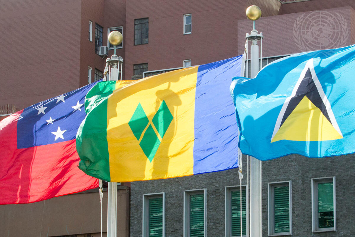 The flag of Saint Vincent and the Grenadines (centre) flying at UN headquarters in New York.