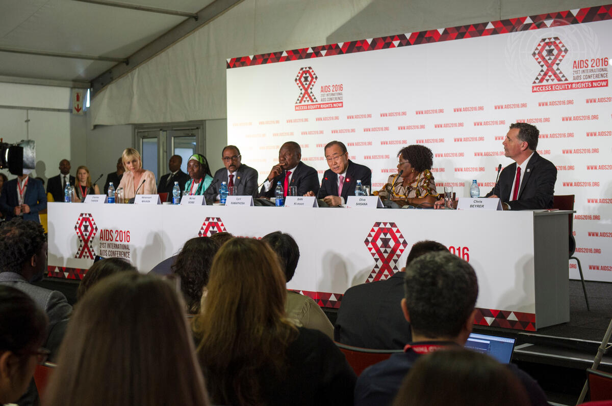 Secretary-General Ban Ki-moon (third from right) speaks at the opening press conference of the 21st International AIDS Conference (AIDS 2016), in Durban, South Africa. He is flanked by Cyril Ramaphosa (left), Deputy President of the Republic of South Africa; and Olive Shisana, AIDS 2016 Local Co-Chair and CEO of the South African Human Sciences Research Council (HSRC). Also pictured on dais (from right): Chris Beyrer, AIDS 2016 International Chair and President of International AIDS Society; Michel Sidibé, Executive Director of the Joint United Nations Programme on HIV and AIDS (UNAIDS); Nkhensani Mavasa, National Chairperson of Treatment Action Campaign (TAC), a South African civil society organization; Charlize Theron, actor, UN Messenger of Peace and founder of the Charlize Theron Africa Outreach Project (CTAOP).