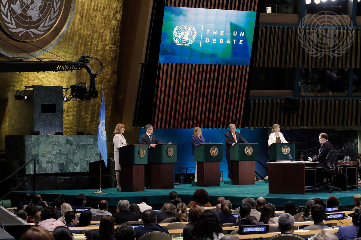 Secretary-General candidates participating in the debate (from left): Natalia Gherman, former First Deputy Prime Minister and Minister for Foreign Affairs and European Integration of the Republic of Moldova; Vuk Jeremic, former Minister for Foreign Affairs of the Republic of Serbia and former President of the UN General Assembly; Susana Malcorra, Minister for Foreign Affairs of Argentina; António Guterres, former Prime Minister of Portugal and former UN High Commissioner for Refugees; Vesna Pusic, First Deputy Prime Minister and Minister for Foreign and European Affairs of the Republic of Croatia.