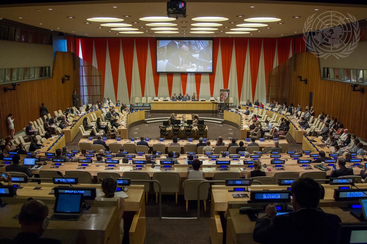 A wide view of the Economic and Social Council (ECOSOC) Chamber as Deputy Secretary-General Jan Eliasson (shown on screen) addresses the General Assembly’s informal meeting in observance of Nelson Mandela International Day (18 July).