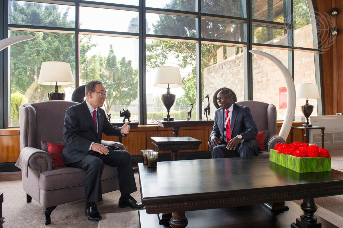 Secretary-General Ban Ki-moon (left) meets with Willy Bett, Cabinet Secretary of the Ministry of Agriculture, Livestock and Fisheries of the Republic of Kenya, on the margins of the the fourteenth session of the UN Conference on Trade and Development (UNCTAD).