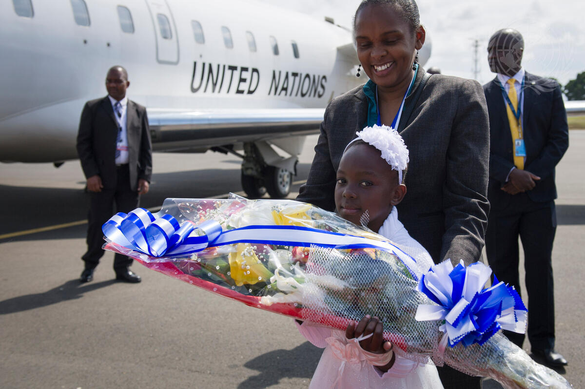 A child prepares to present a bouquet of flowers to Secretary-General Ban Ki-moon (left) upon his arrival in Nairobi where he will attend the fourteenth session of the UN Conference on Trade and Development (UNCTAD)