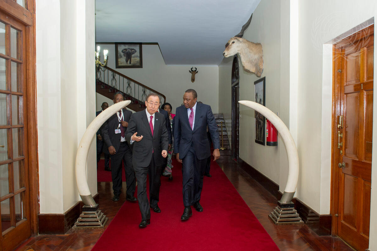 Secretary-General Ban Ki-moon (left) meets with Uhuru Kenyatta, President of the Republic of Kenya, at the Kenyan State House. Both will subsequently attend the opening of the fourteenth session of the UN Conference on Trade and Development (UNCTAD), taking place in Nairobi, 17-22 July 2016.
