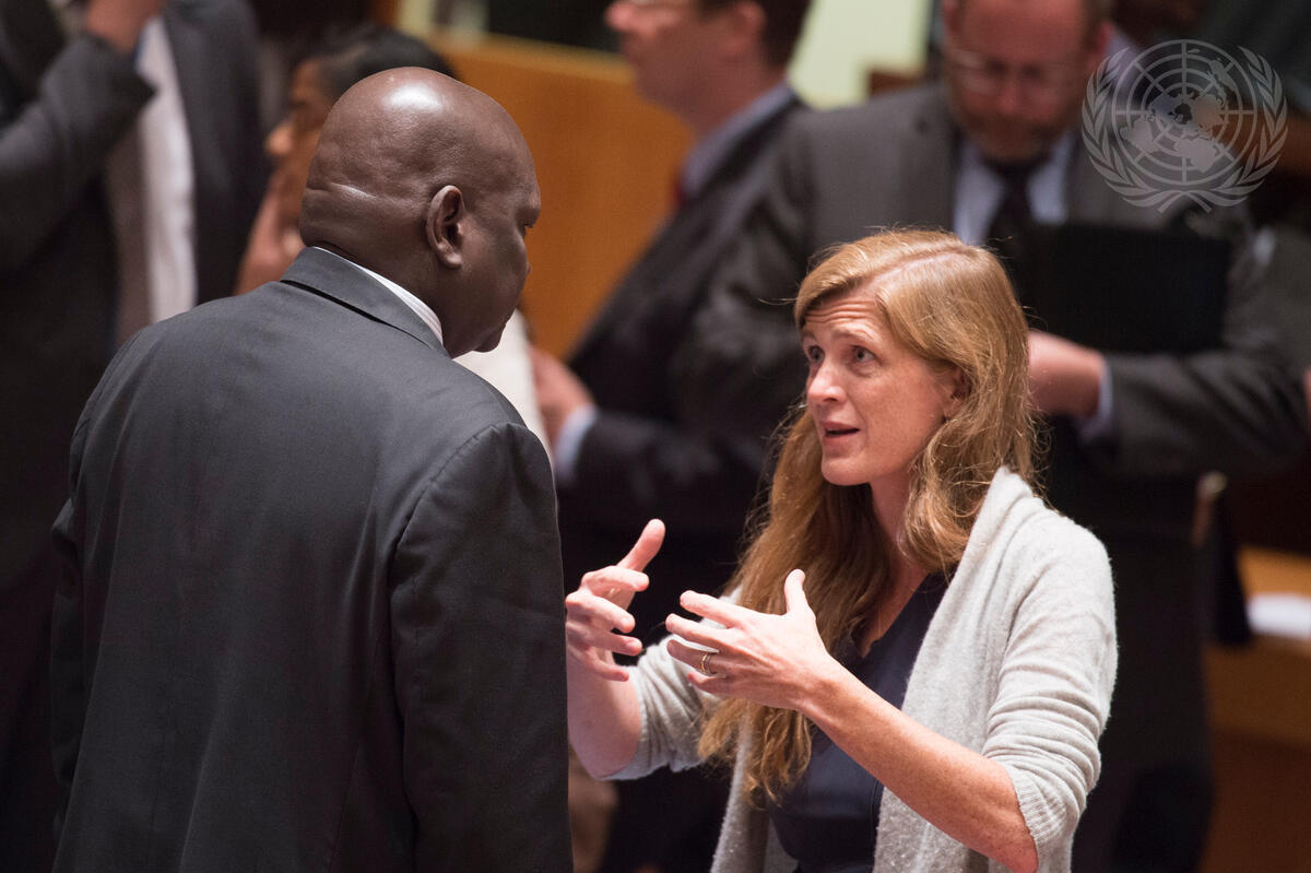 Samantha Power, United States Permanent Representative to the UN, speaking with Akuei Bona Malwal, Permanent Representative of the Republic of South Sudan, at the Security Council meeting on the situation in South Sudan.