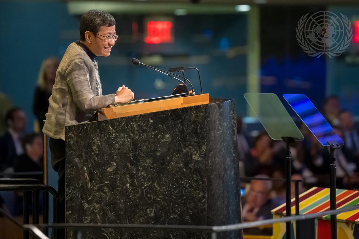 Maria Ressa, 2021 Nobel Peace Prize Laureate, addresses the high-level meeting of the General Assembly to commemorate the eightieth anniversary of the establishment of the United Nations.