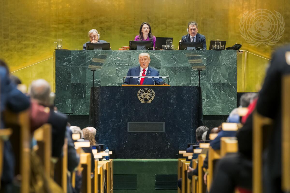 Donald Trump (at podium), President of the United States of America, addresses the general debate of the General Assembly’s eightieth session.