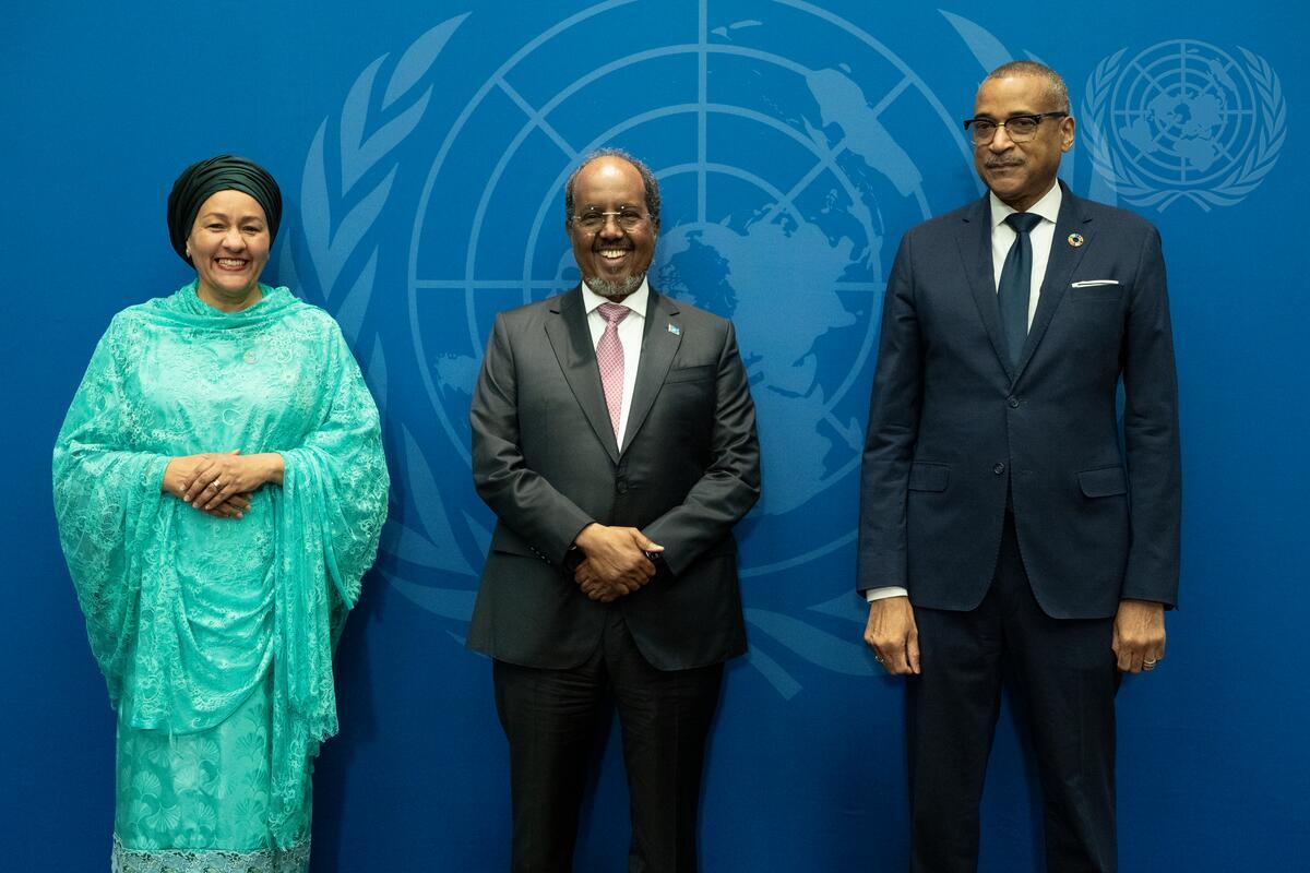 Deputy Secretary-General Amina Mohammed (left), and Courtenay Rattray (right), Chef de Cabinet of the Secretary-General greet global leaders on the second day of 80th General Assembly Debate.